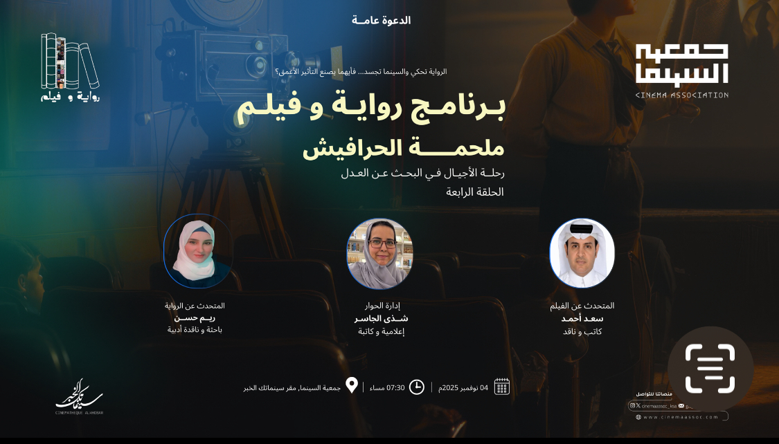 تقام يوم الثلاثاء 4 نوفمبر 2025، في جمعية السينما مقر سينماتك الخبر، ابتداءً من الساعة 7:30 مساءً. ويهدف البرنامج إلى استكشاف العلاقة بين الأدب والسينما من خلال تحليل رواية “ملحمة الحرافيش” للأديب العالمي نجيب محفوظ، وكيفية تحويلها إلى عمل سينمائي.
